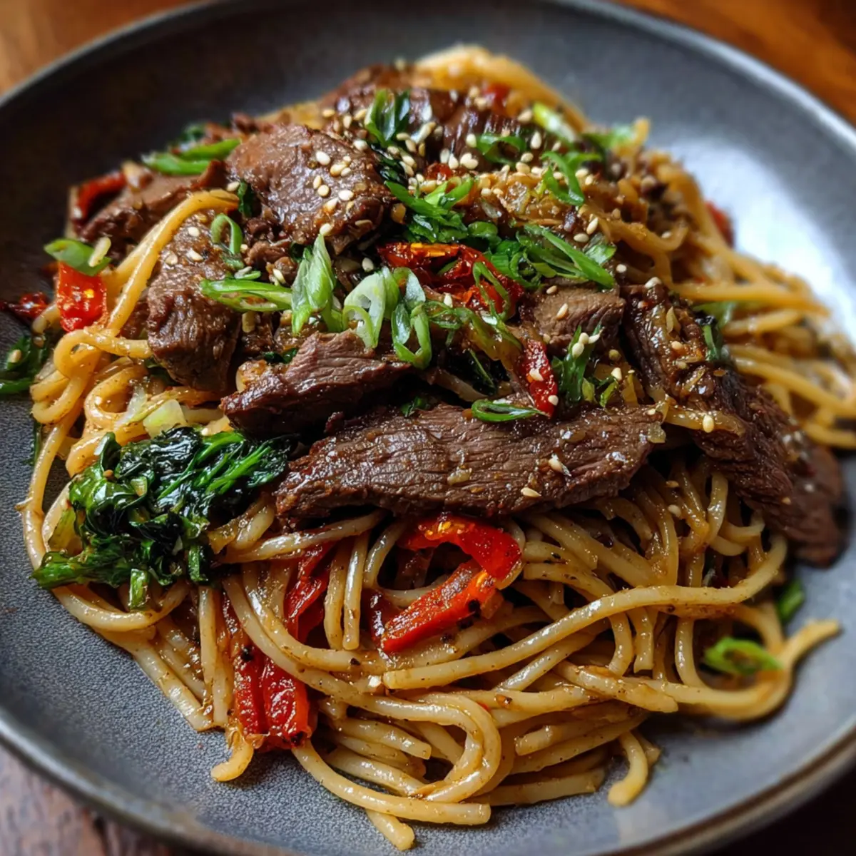 Garnish your noodles with an array of fresh herbs like cilantro and green onions. Not only do they add a burst of color, but they also lend a refreshing zing that beautifully balances the heat of the beef.