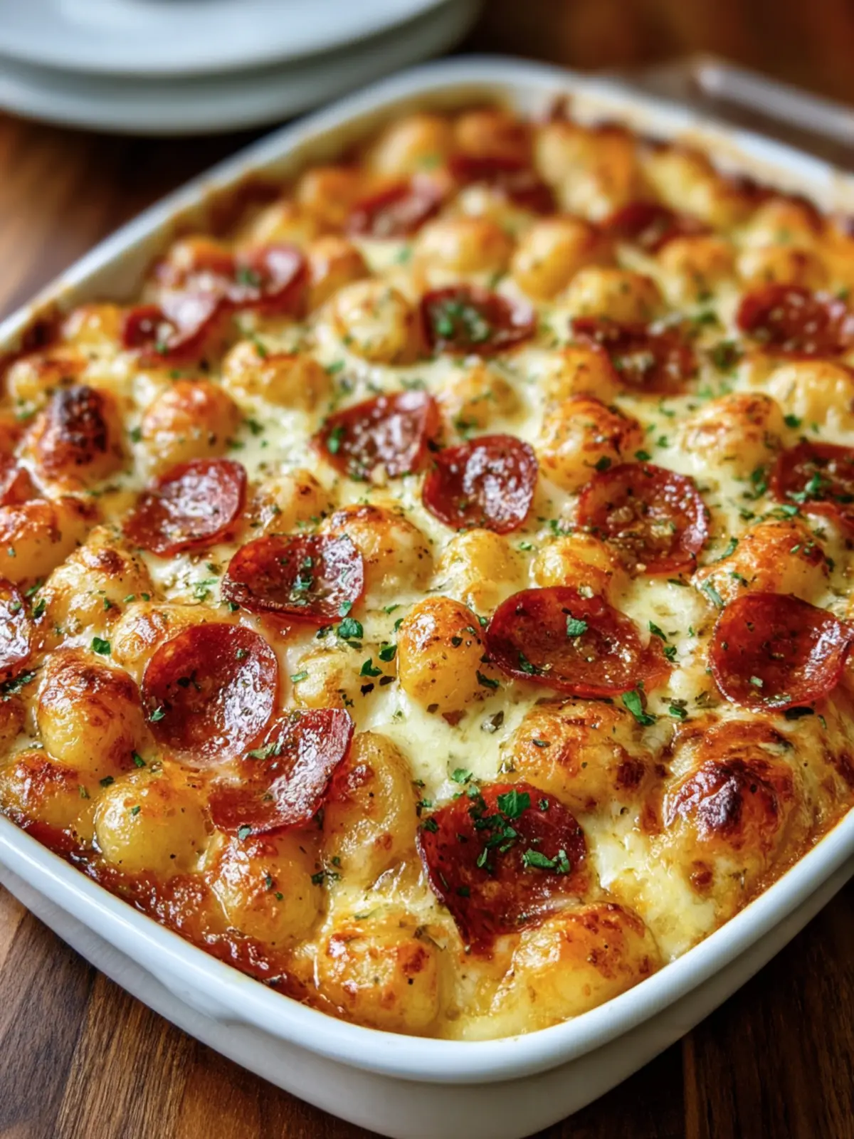 A delicious casserole featuring gnocchi, marinara sauce, mozzarella cheese, and pepperoni, baked to perfection.