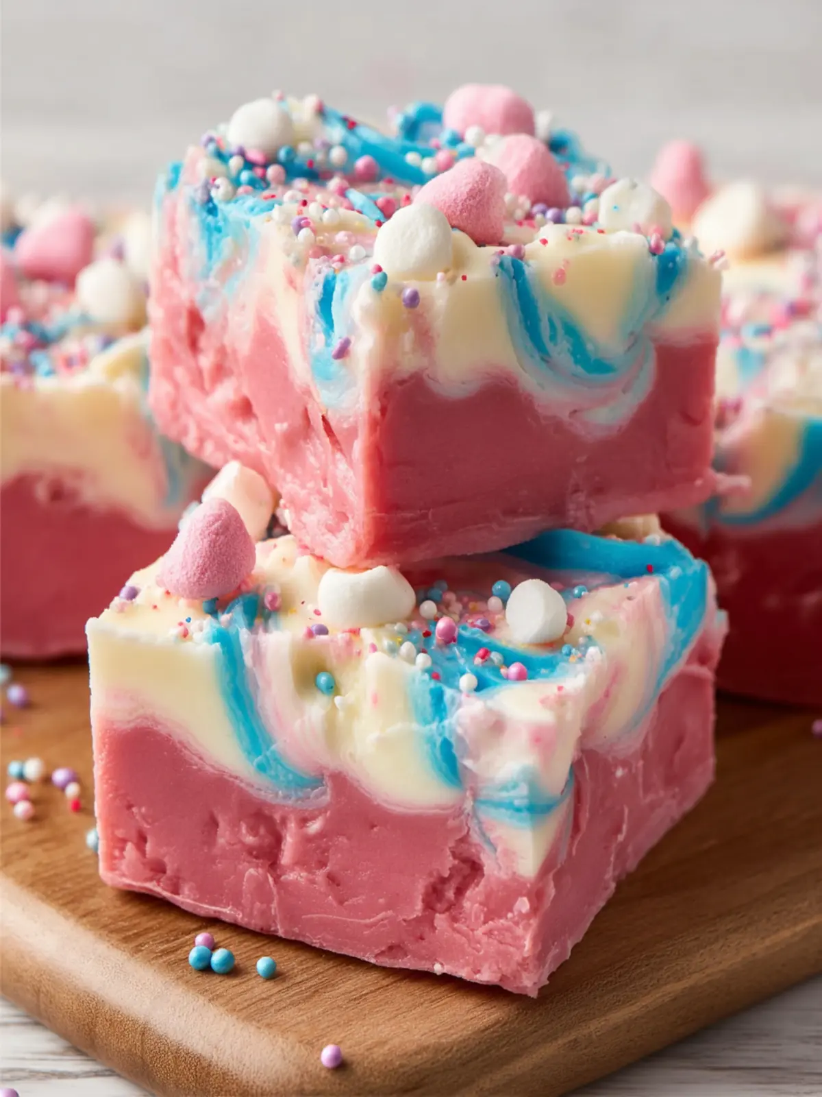 A colorful and delightful cotton candy fudge that is perfect for parties or a sweet treat.