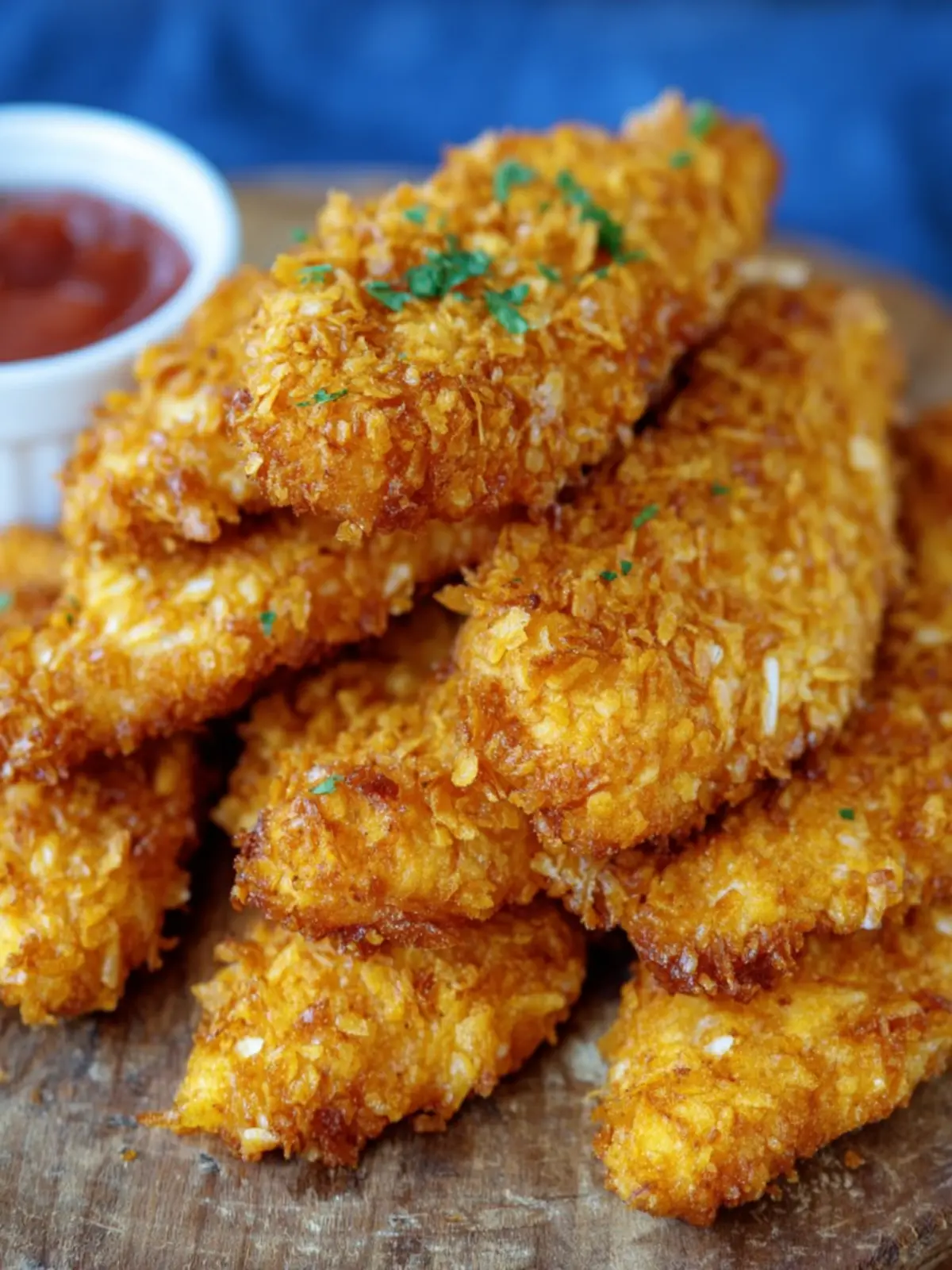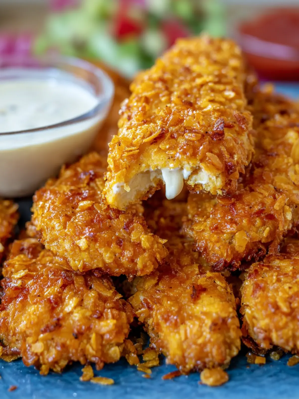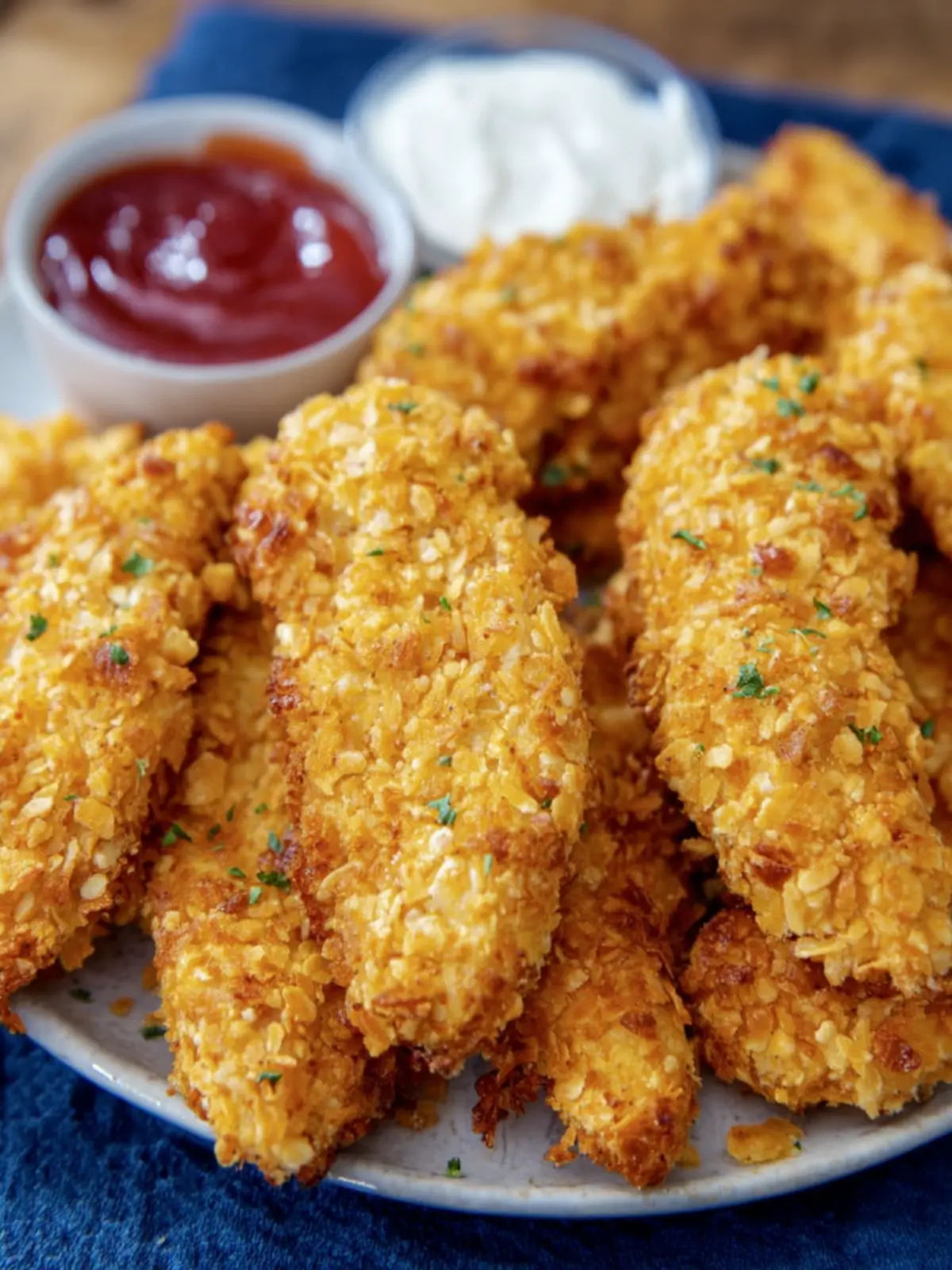 Deliciously crispy chicken tenders coated in cornflakes for a delightful crunch.