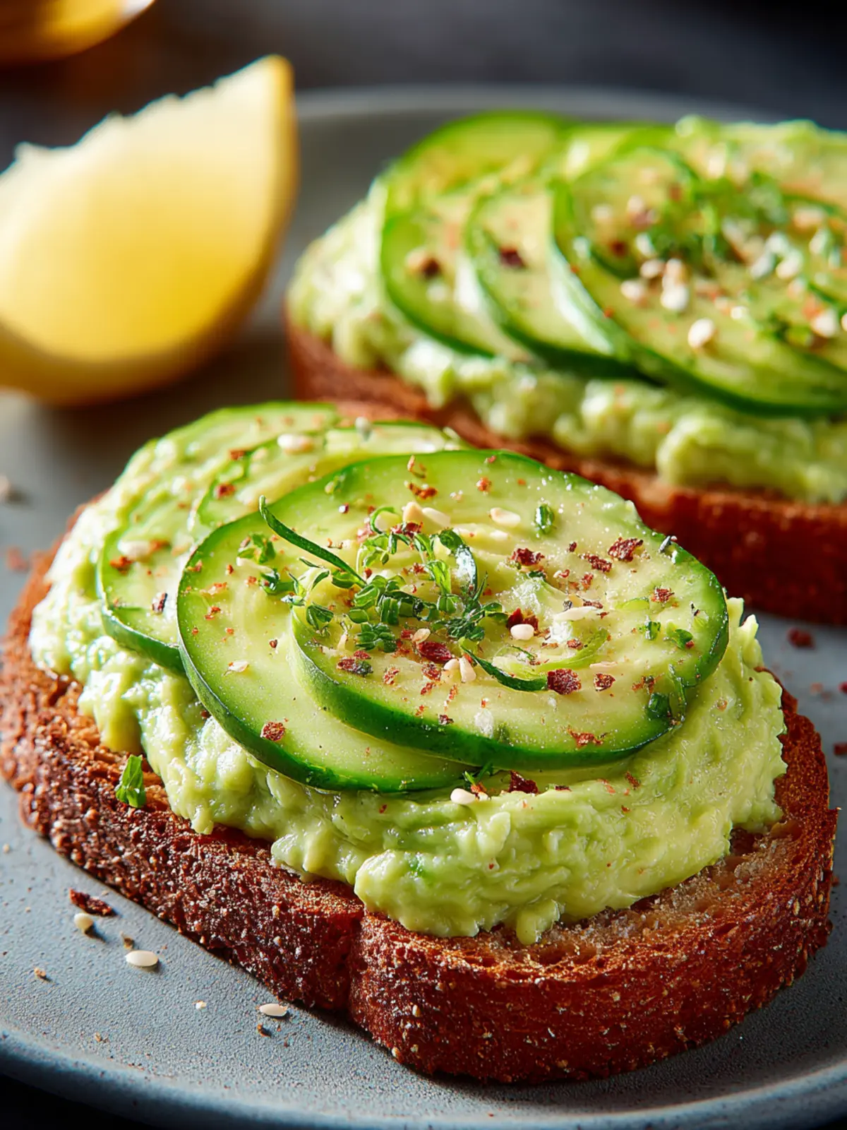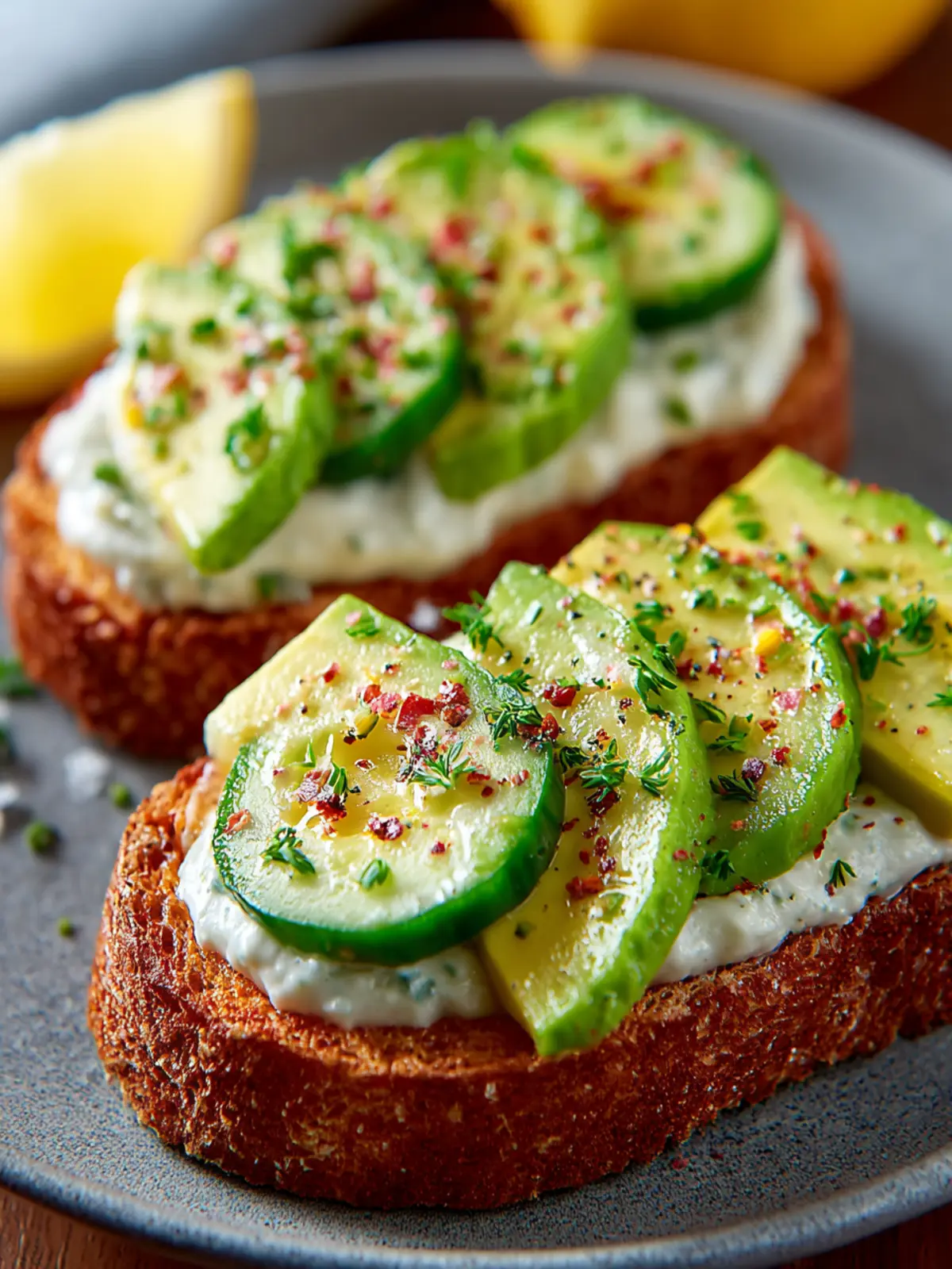 A delicious and nutritious avocado toast topped with Greek yogurt, cucumber, and smoked paprika.