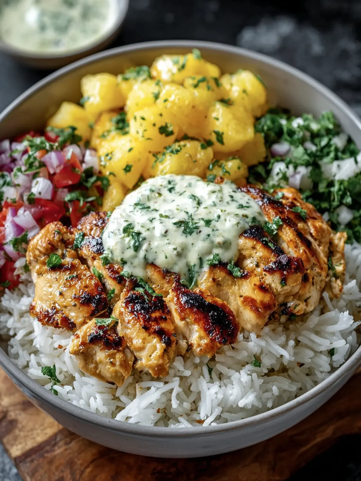 A delicious and healthy grilled chicken rice bowl, garnished with fresh herbs and a creamy yogurt sauce.
