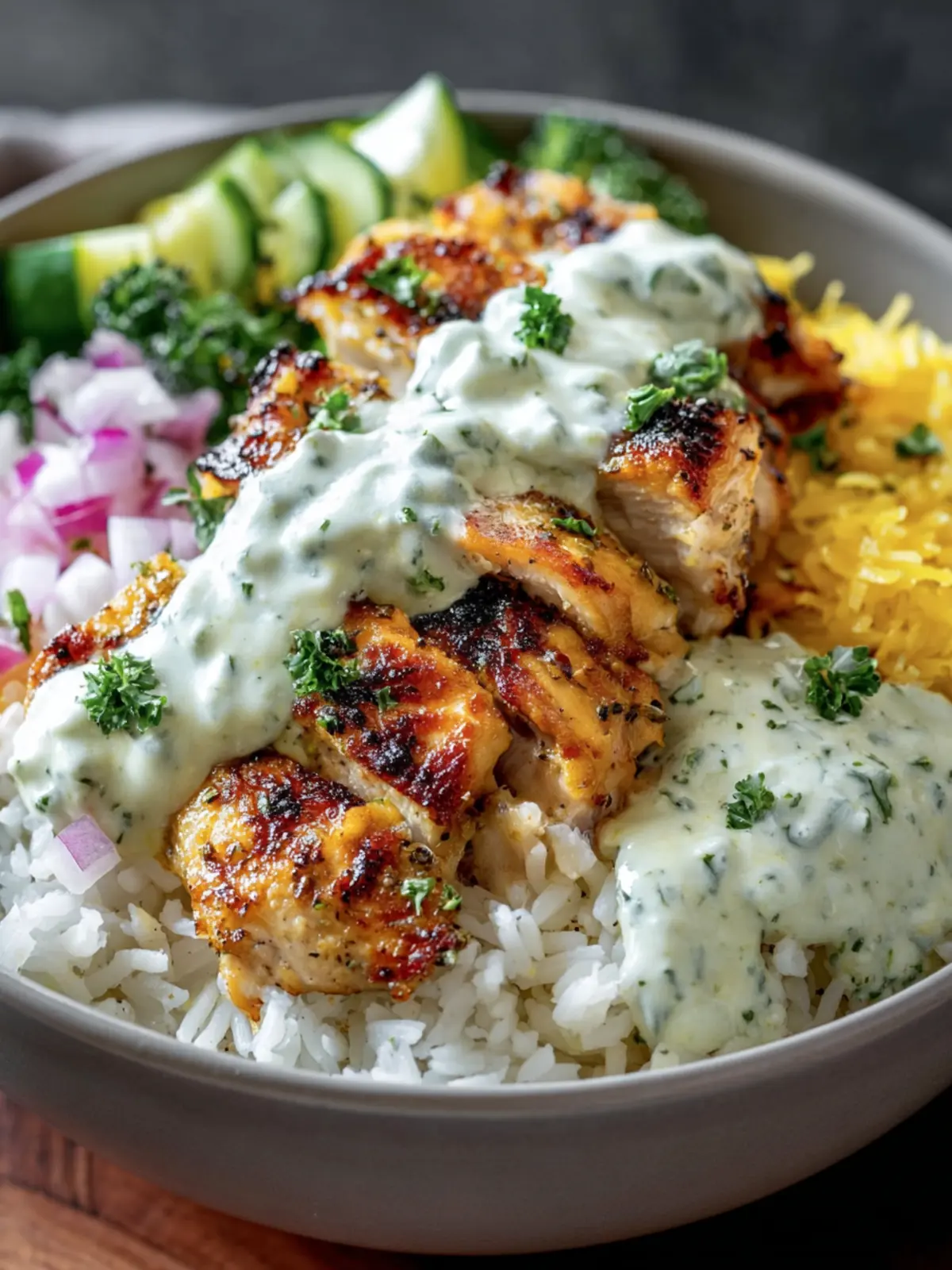 Place a serving of rice in a bowl. Top with sliced grilled chicken. Add a generous spoonful of the yogurt sauce. Garnish with lemon slices and chopped parsley.
