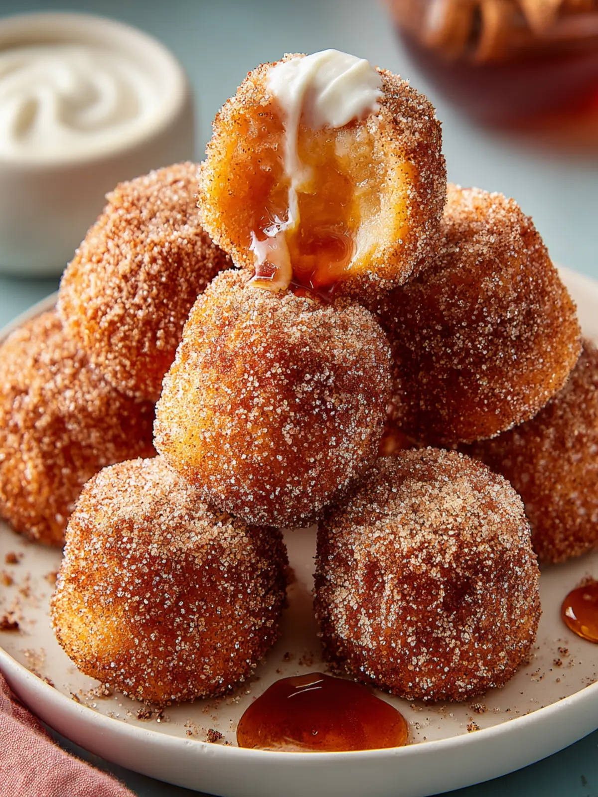 - Coat in Cinnamon Sugar: Mix sugar and cinnamon in a shallow bowl. Once the bites are hot, brush lightly with oil or butter and roll in the cinnamon-sugar mixture until fully coated.