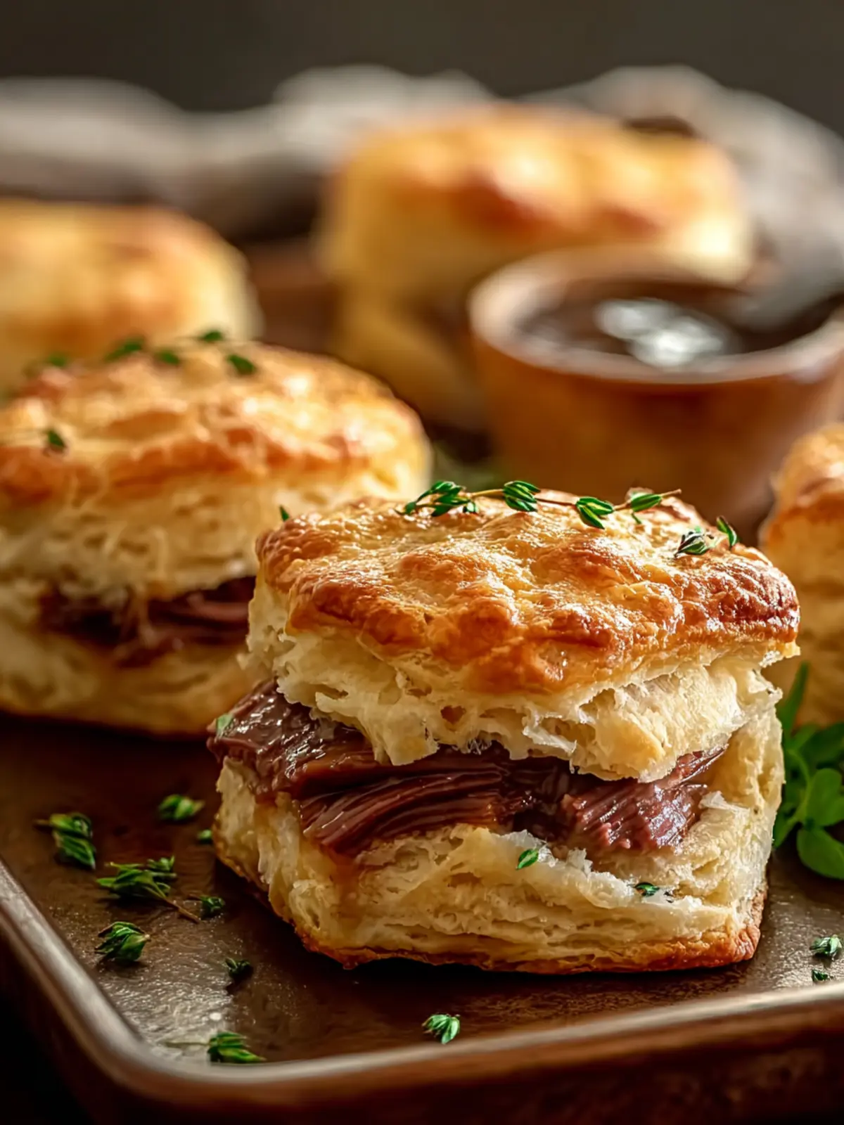 BBQ Sauce: Replace the au jus with your favorite BBQ sauce for a smoky, tangy alternative that pairs beautifully with the sweet biscuits.