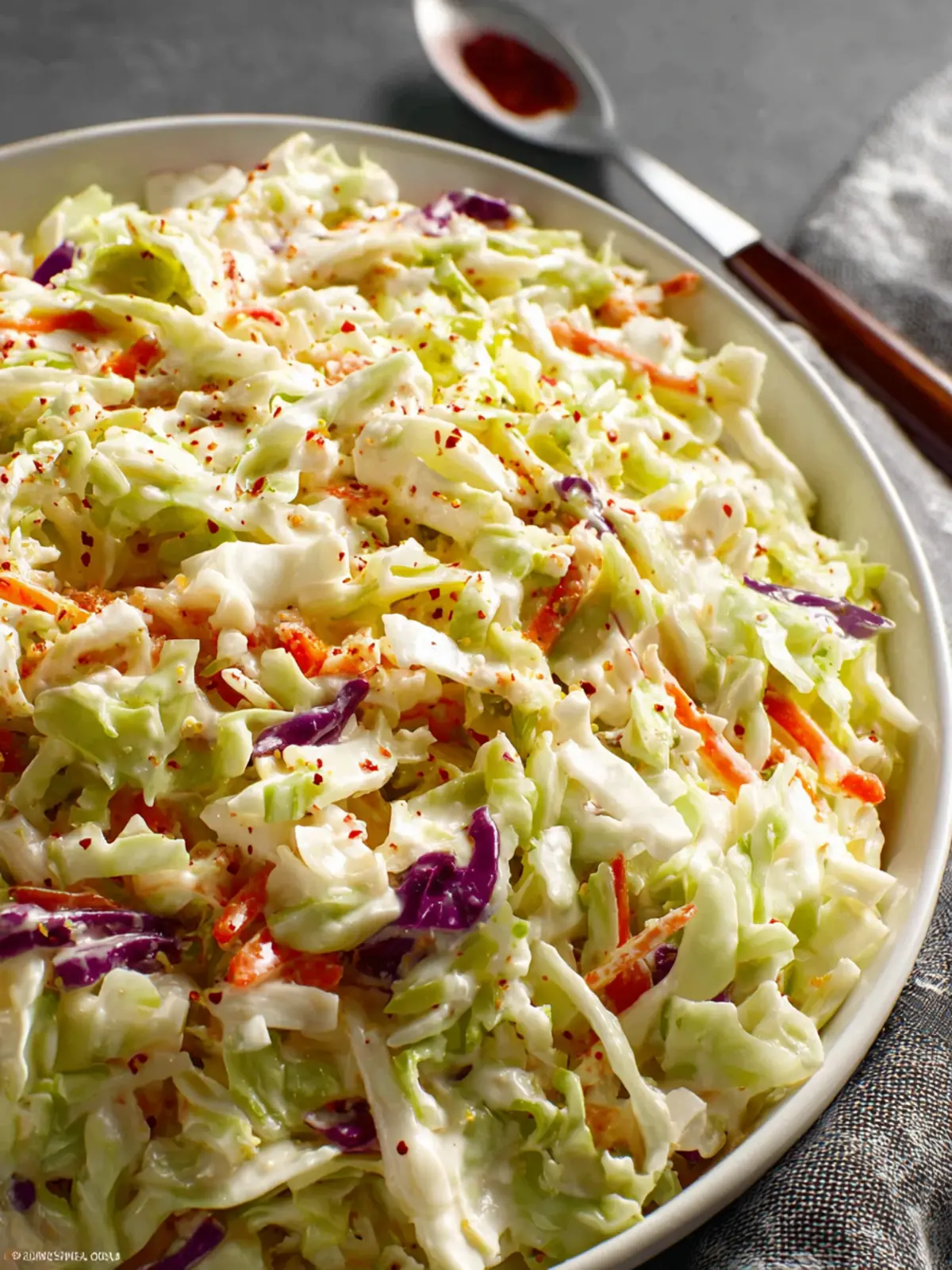 Vinegar: White vinegar adds a punch of acidity, giving the coleslaw its necessary brightness and preventing it from feeling too heavy.