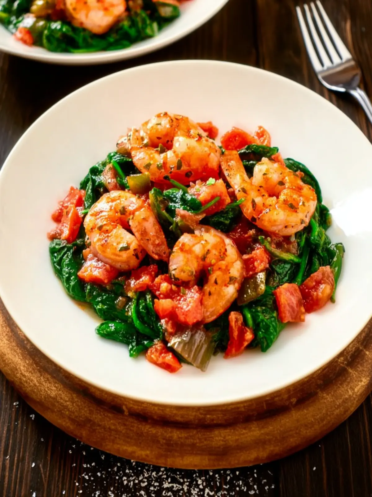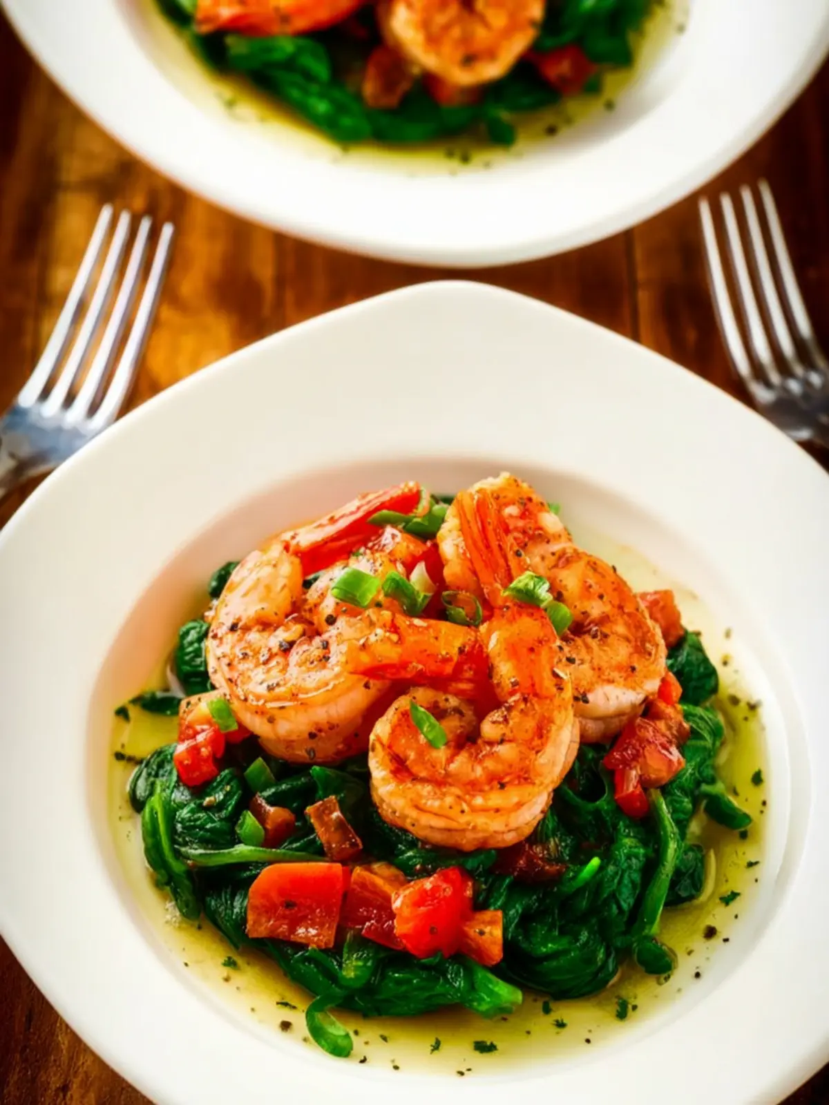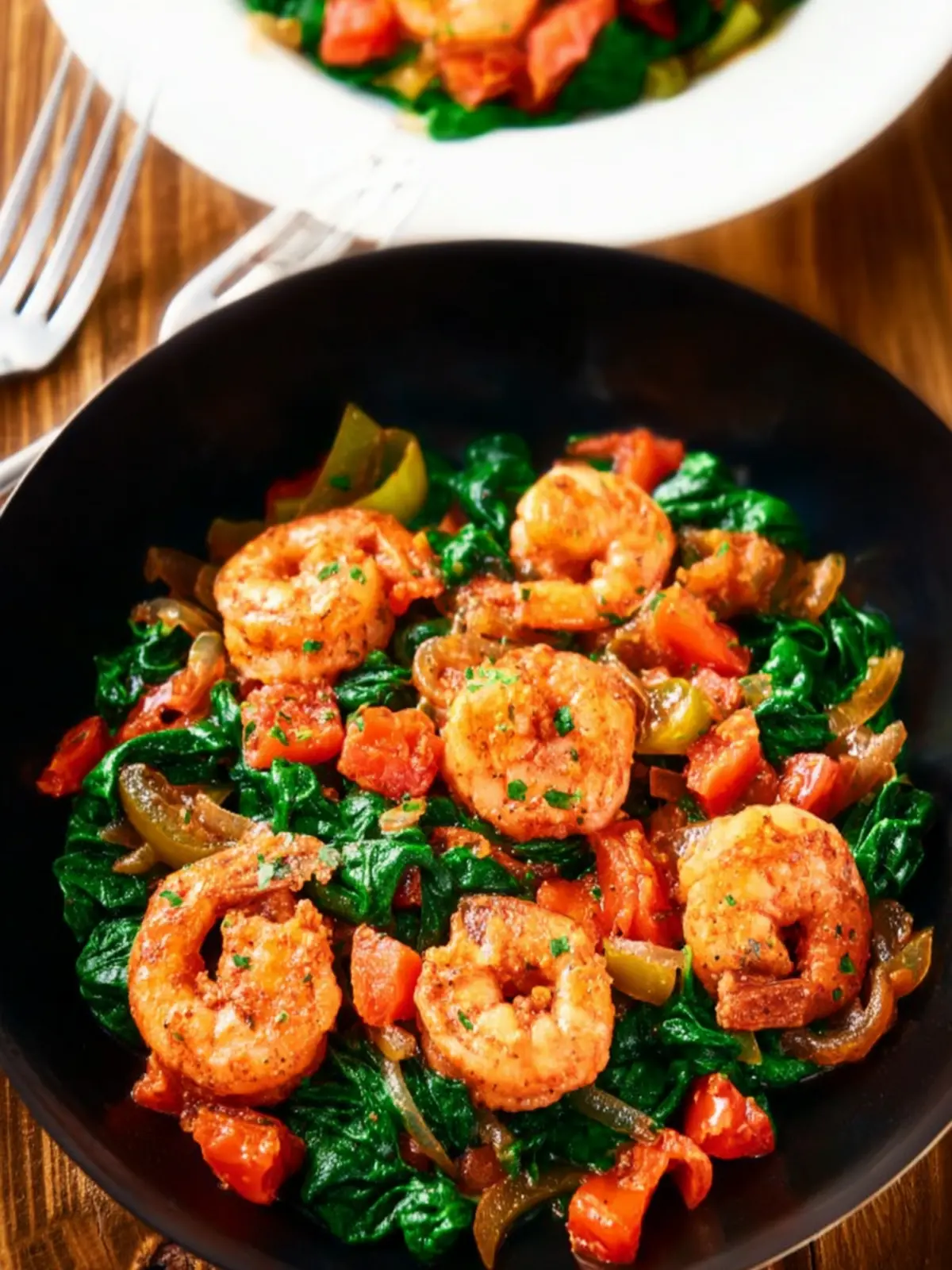 These veggies bring sweetness and a satisfying crunch that contrast perfectly with the tender shrimp and wilted spinach. Their colors not only look appealing but also contribute to the dish’s layered textures.
