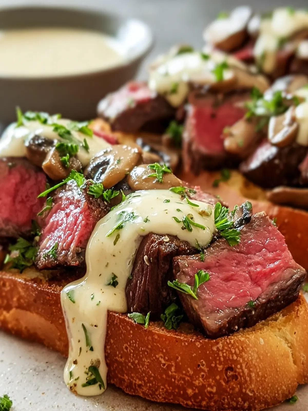 Assemble the Sandwich: Place the toasted bread slices on a serving plate. Slice the steaks thinly and layer them over the bread. Spoon a generous amount of the sauce over the steak. Garnish with chopped parsley.