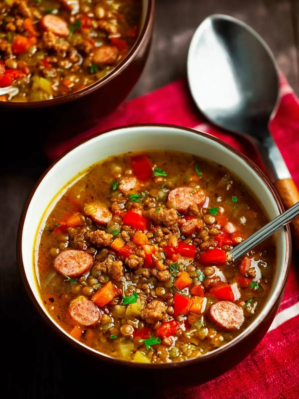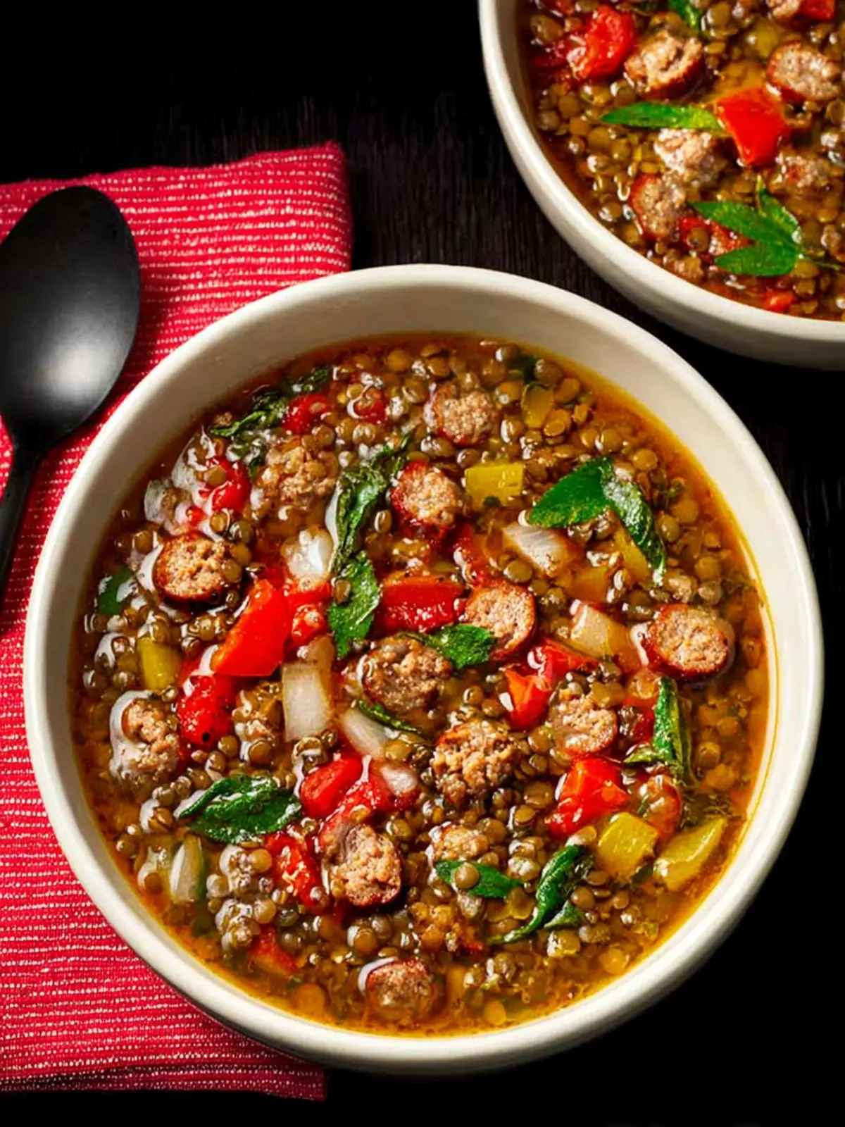 Each ingredient harmonizes to make a comforting bowl of sausage and lentil soup, perfect for sharing with family or savoring on a quiet night in.