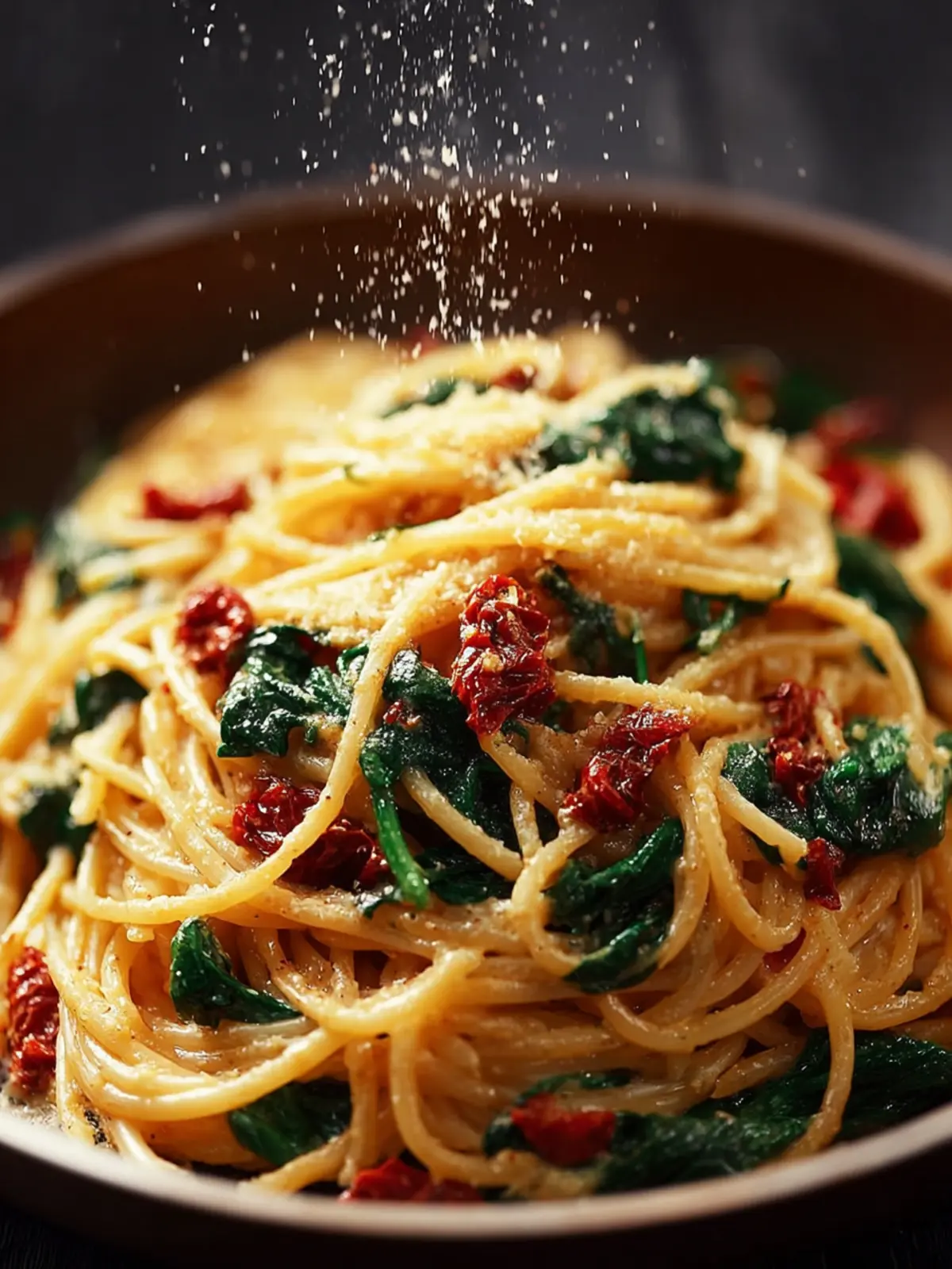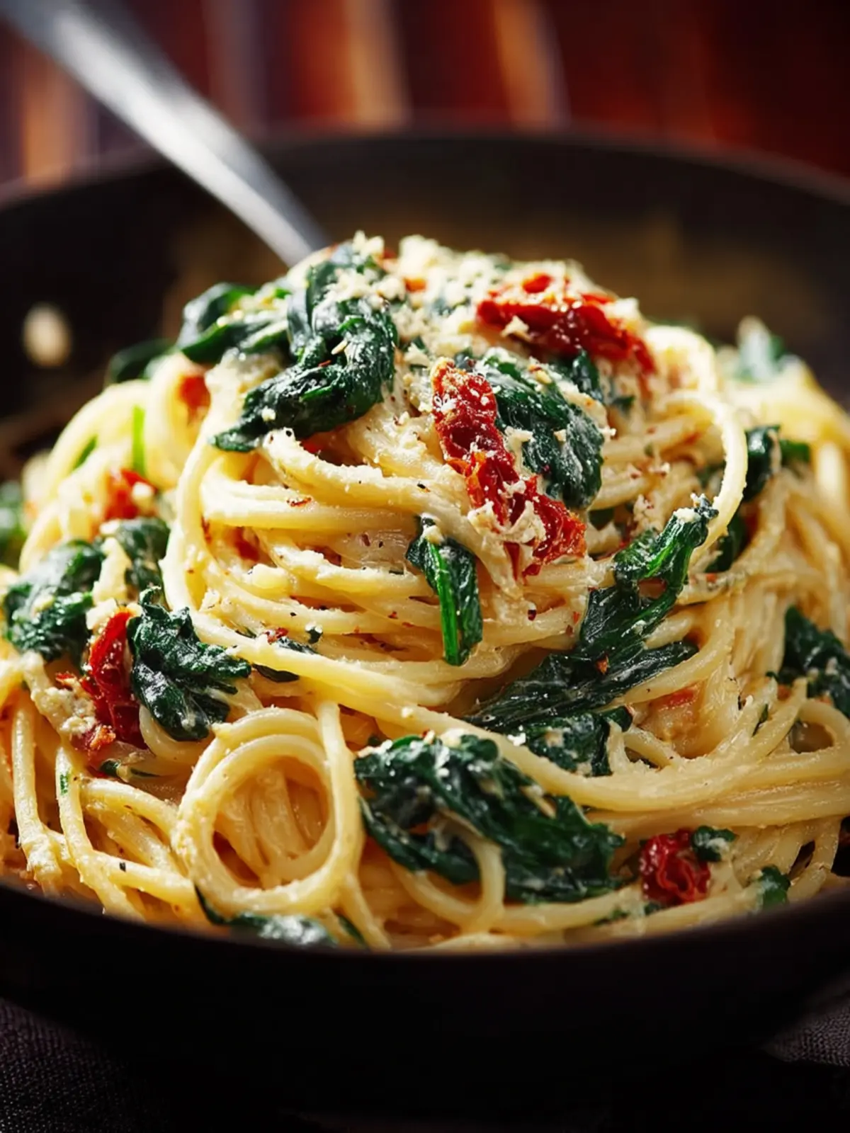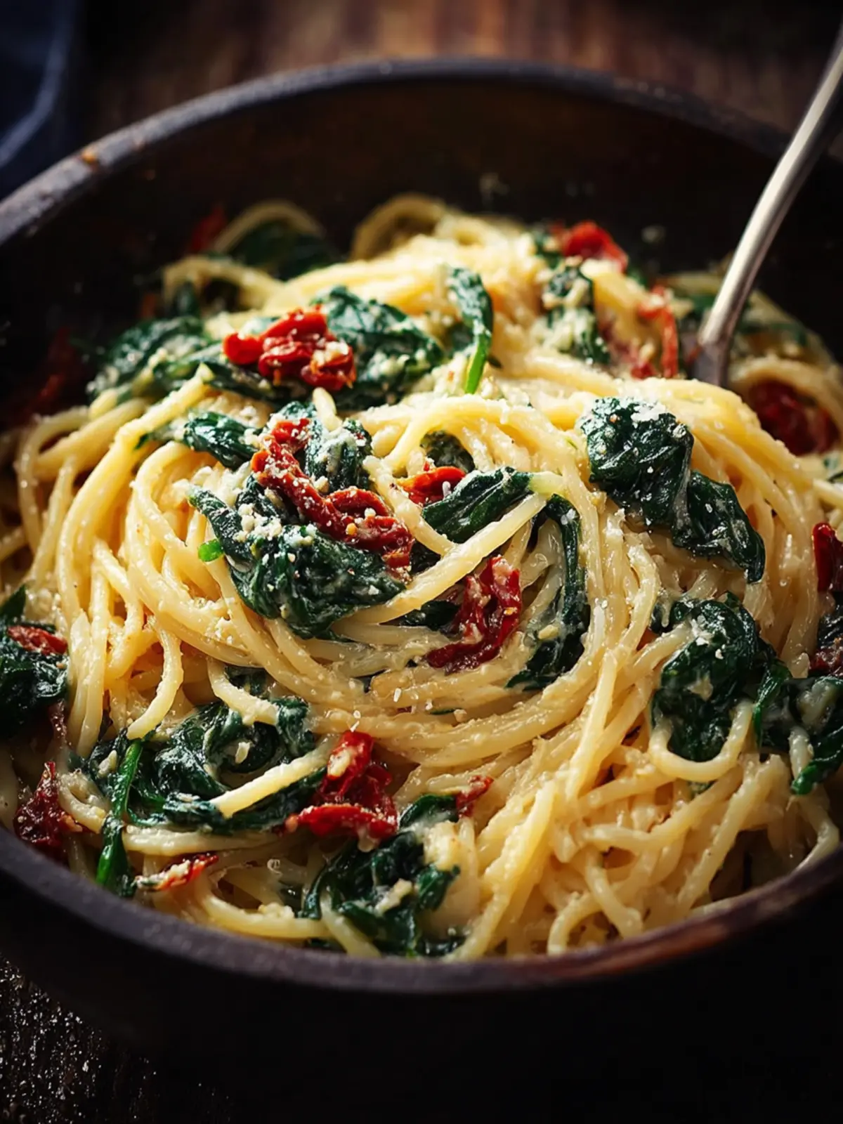A delicious and creamy spaghetti dish with fresh spinach and sun-dried tomatoes.