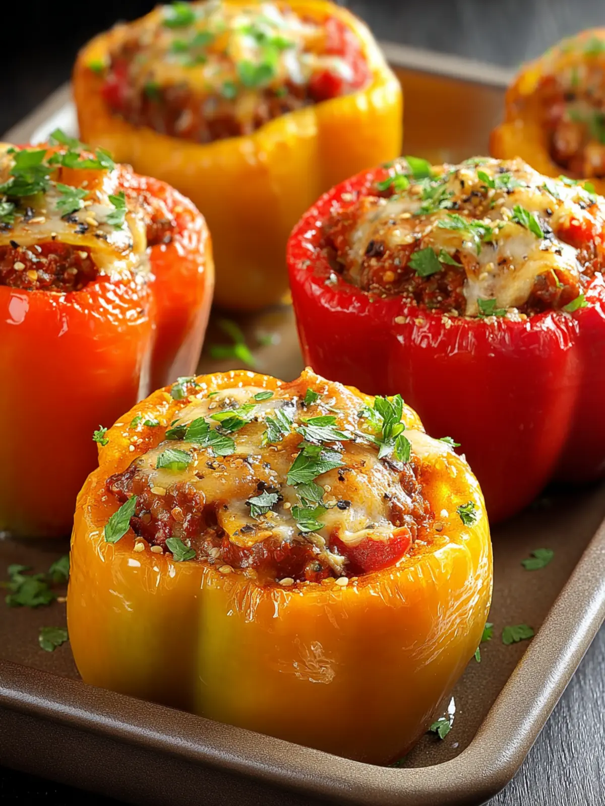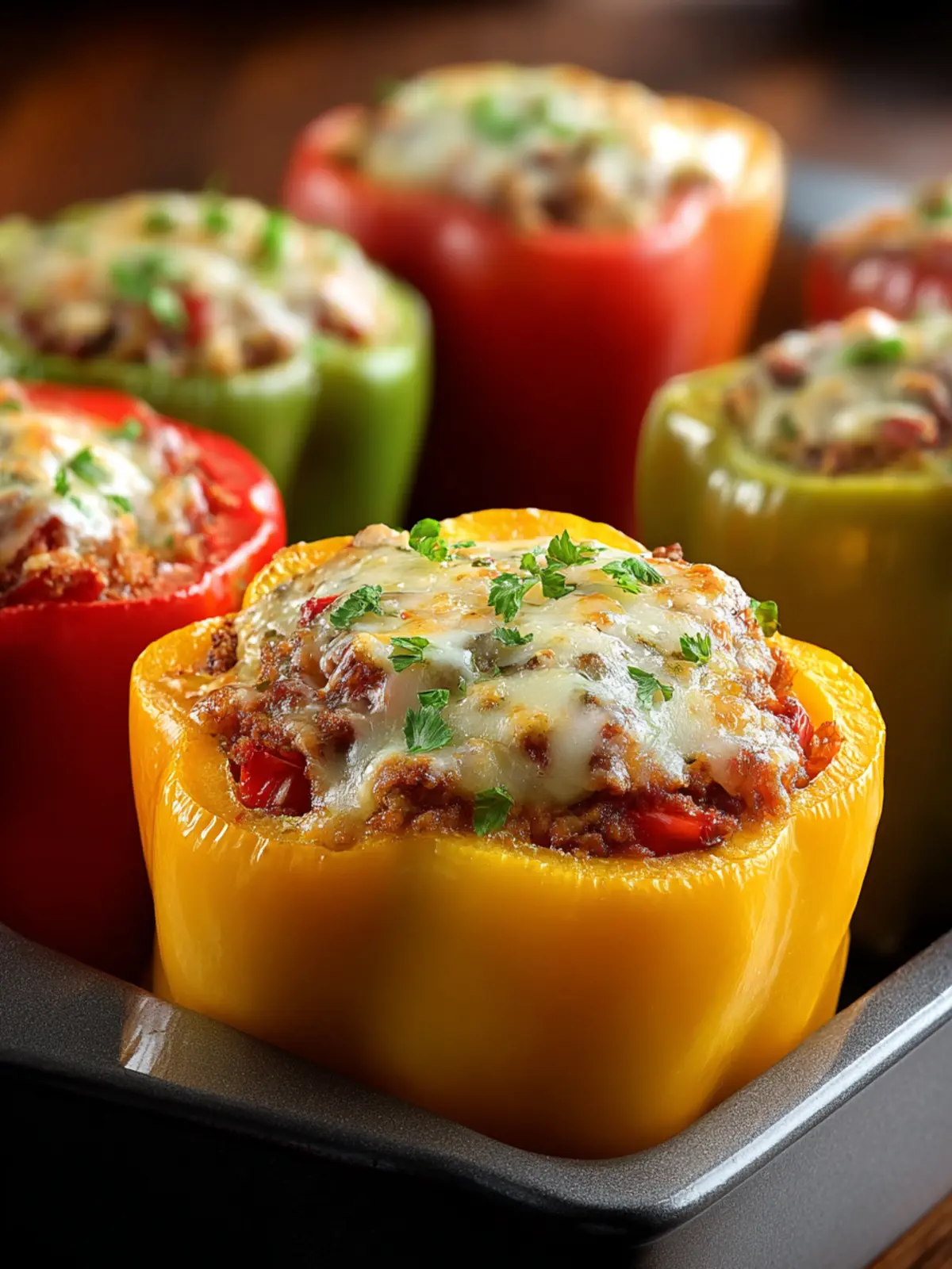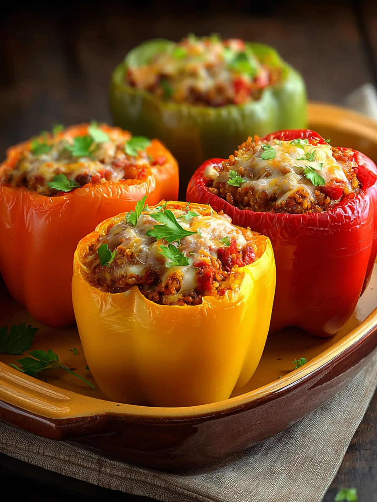 Delicious stuffed bell peppers filled with ground beef, rice, and cheese, baked until bubbly.
