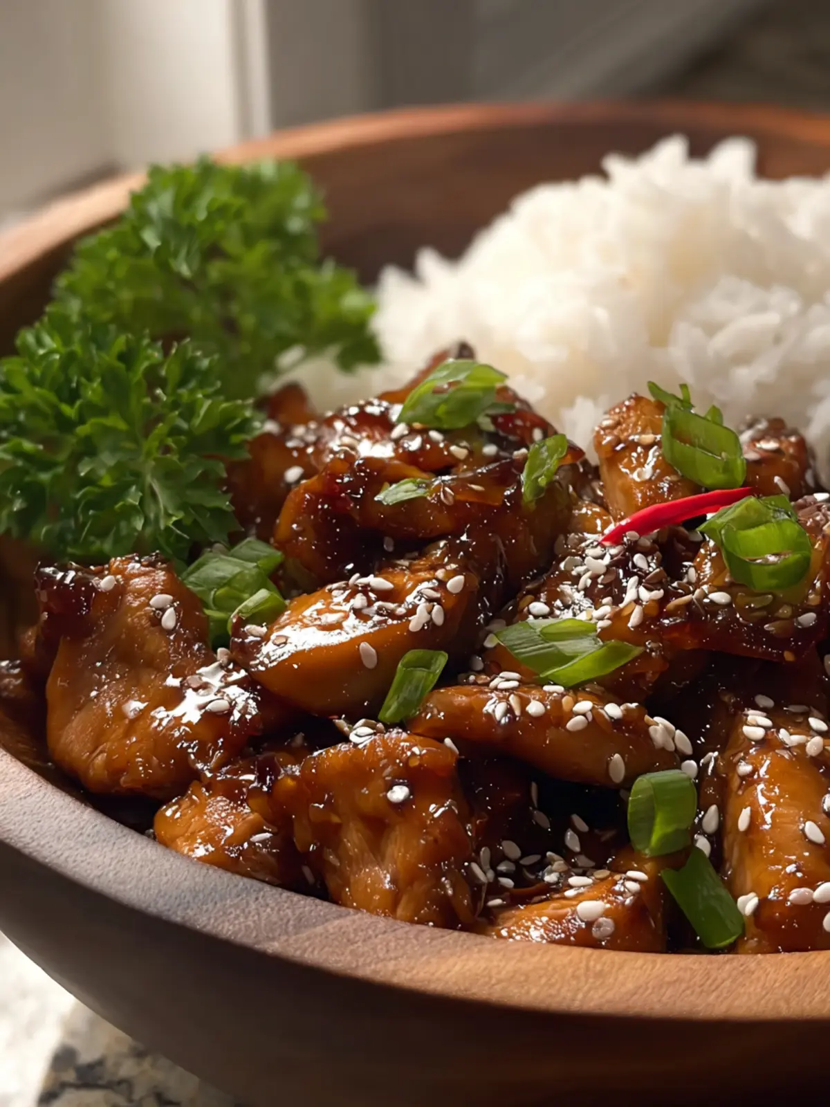 Serve your finished dish with a sprinkle of sesame seeds and sliced green onions. This not only adds a pop of color but also provides a fresh contrast to the sweet-savory chicken.