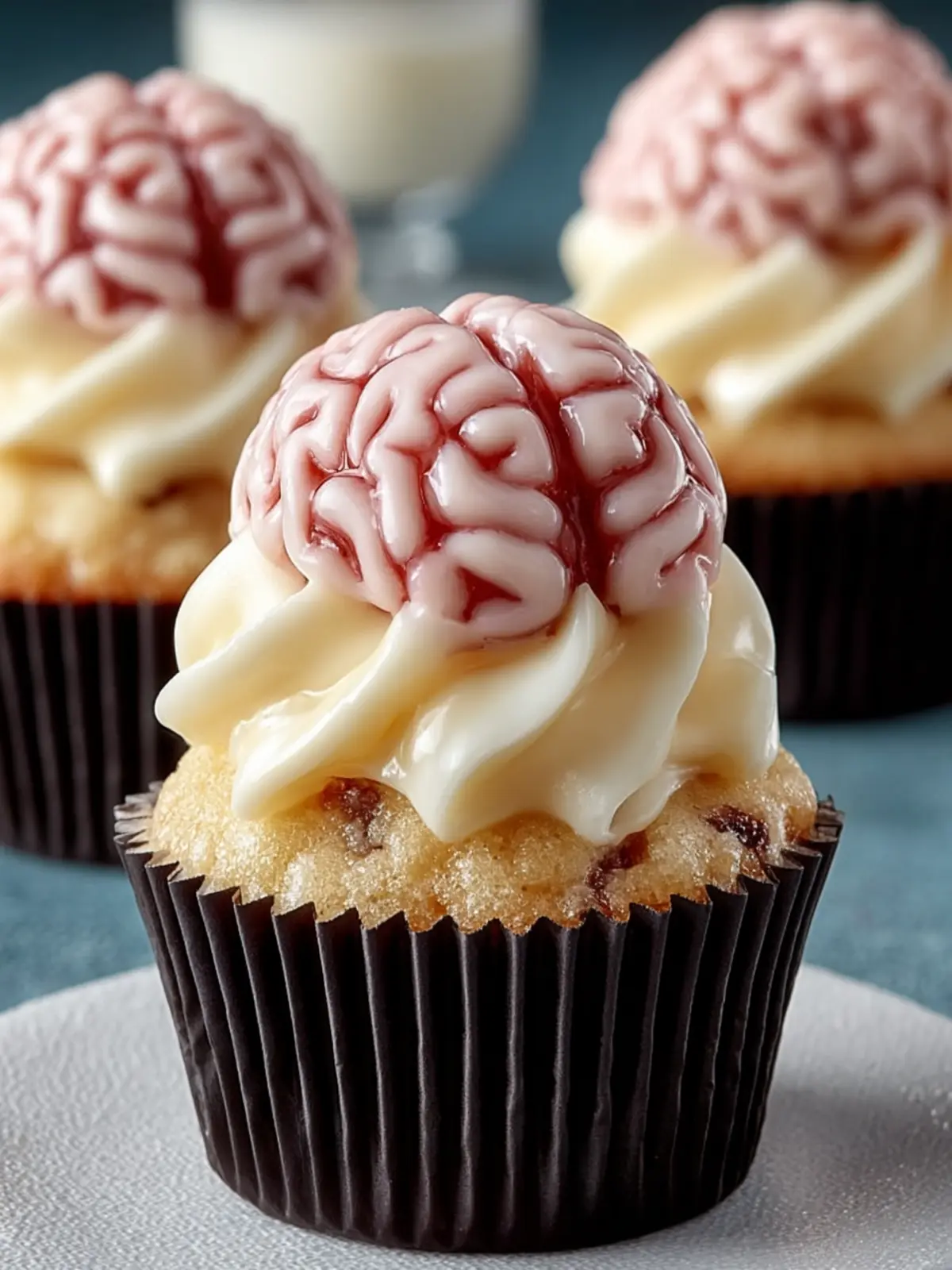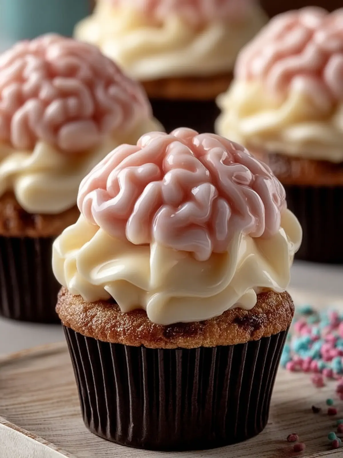 4. Assemble the Cupcakes: Frost the cooled cupcakes with a thin layer of pink buttercream. Gently place the fondant brain decorations on top, pressing slightly to secure.